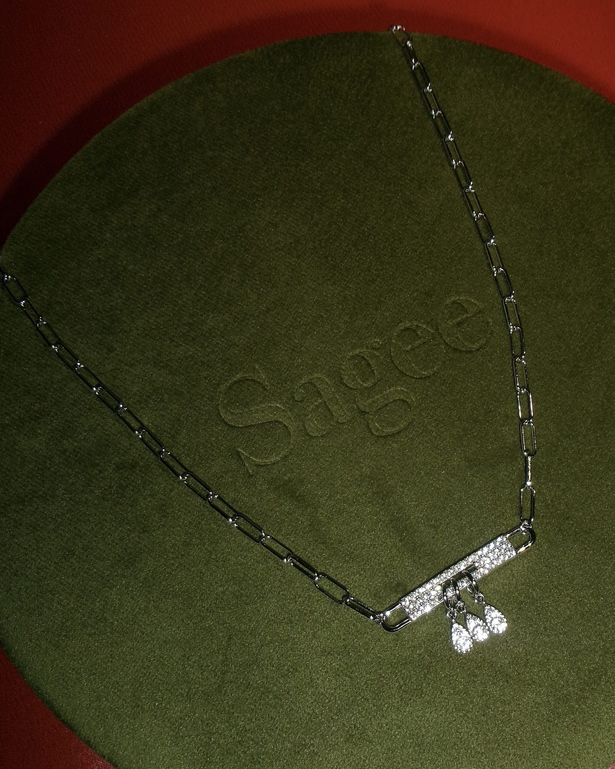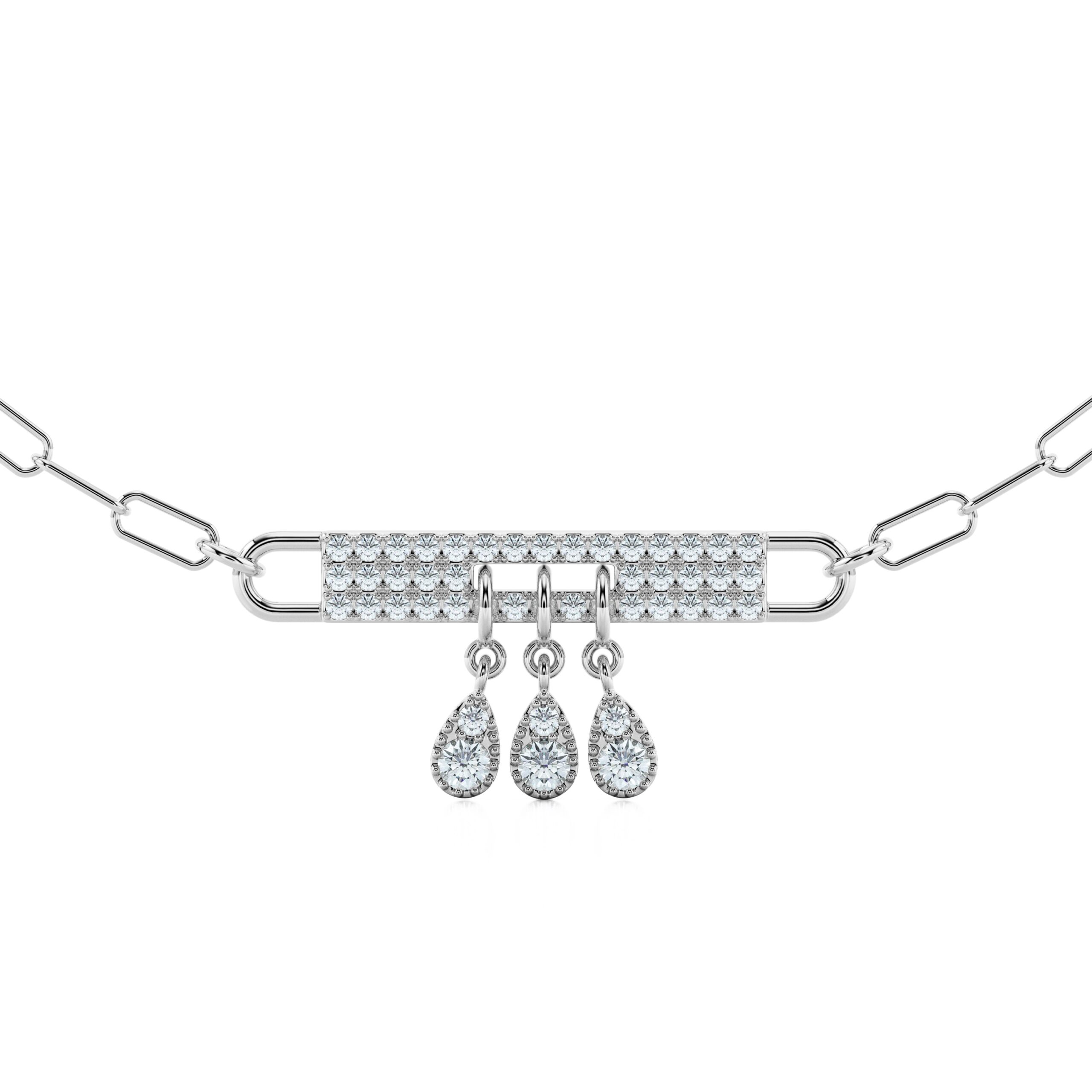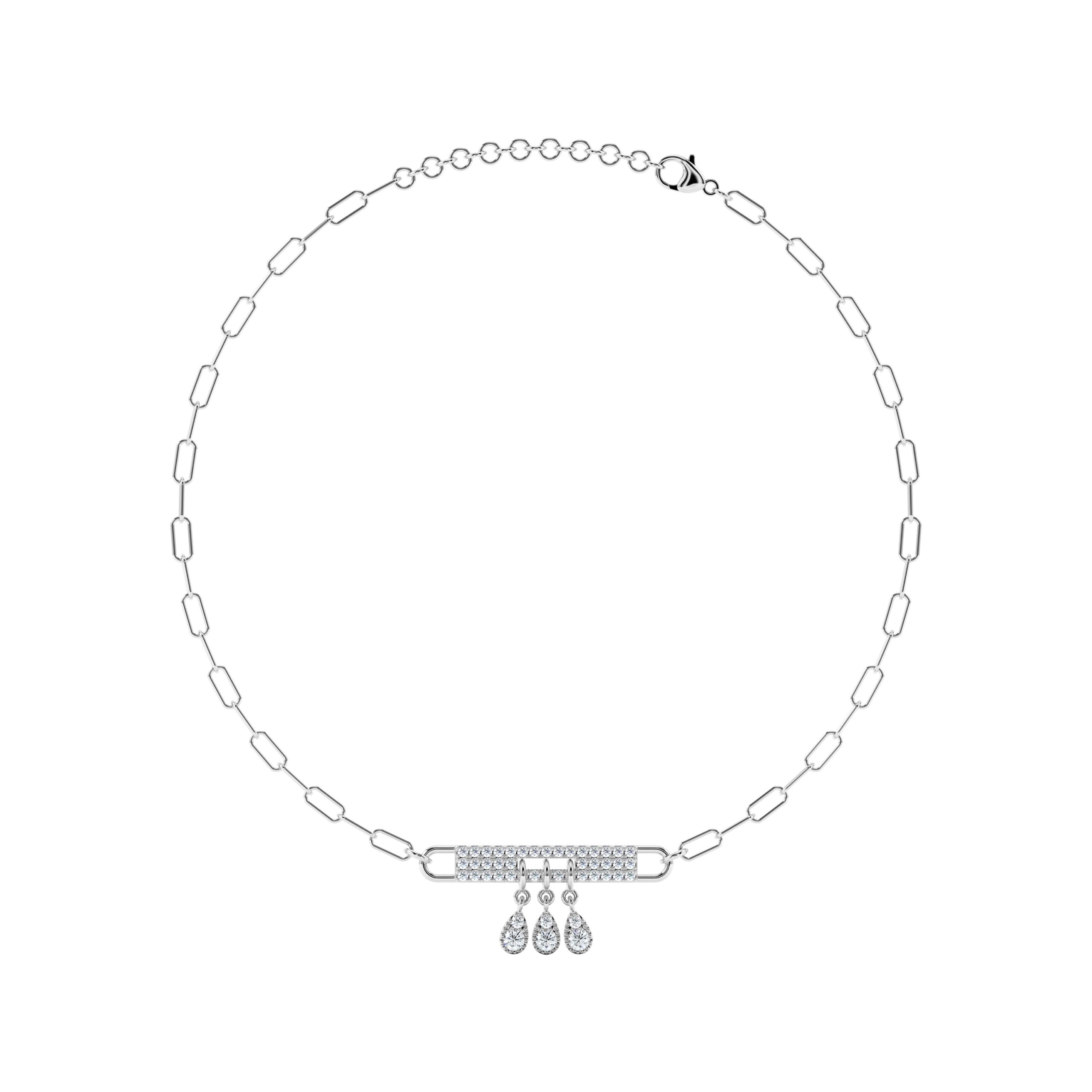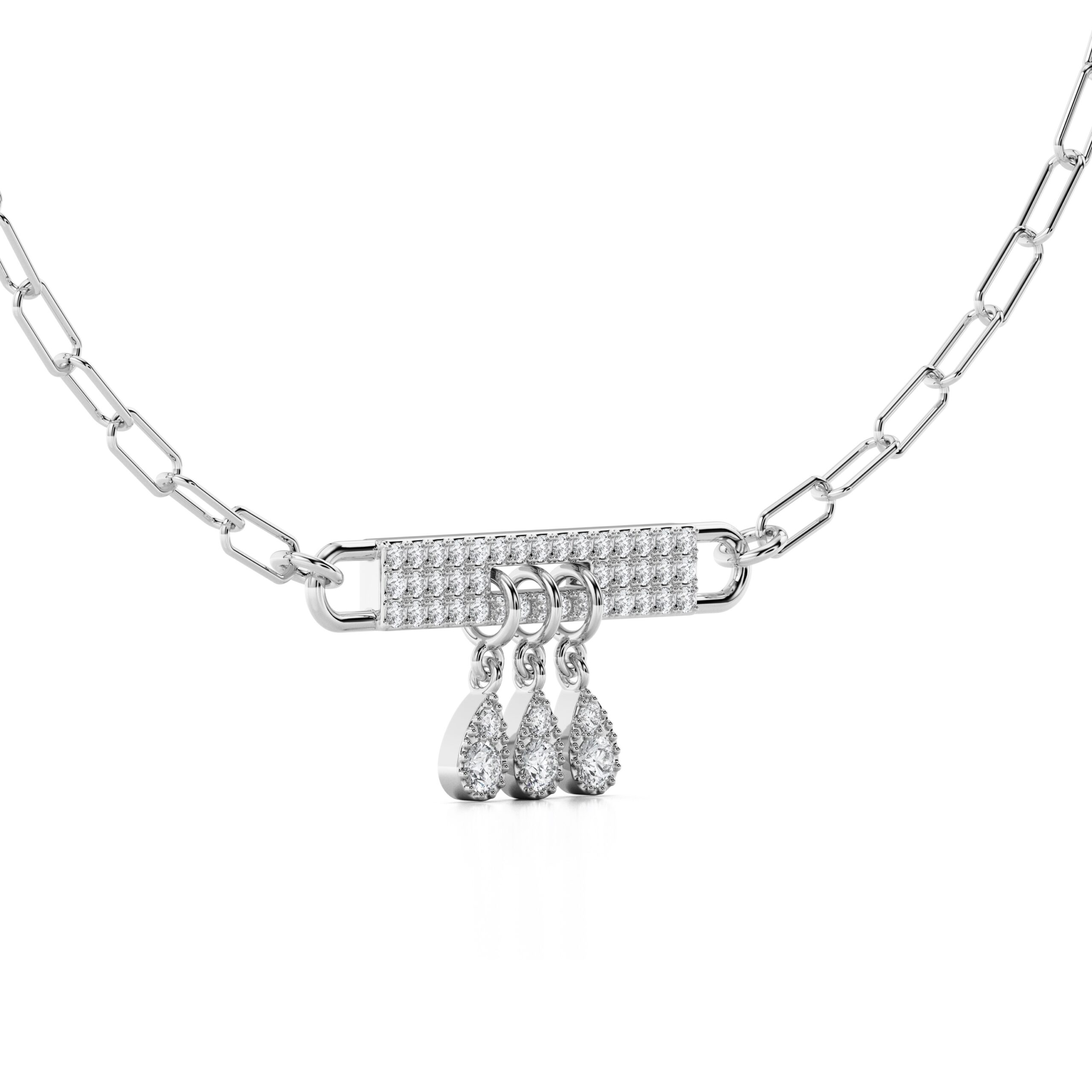 Paved silver bar necklace with three elegant teardrop drops—crafted to embody timeless sophistication and refined luxury.