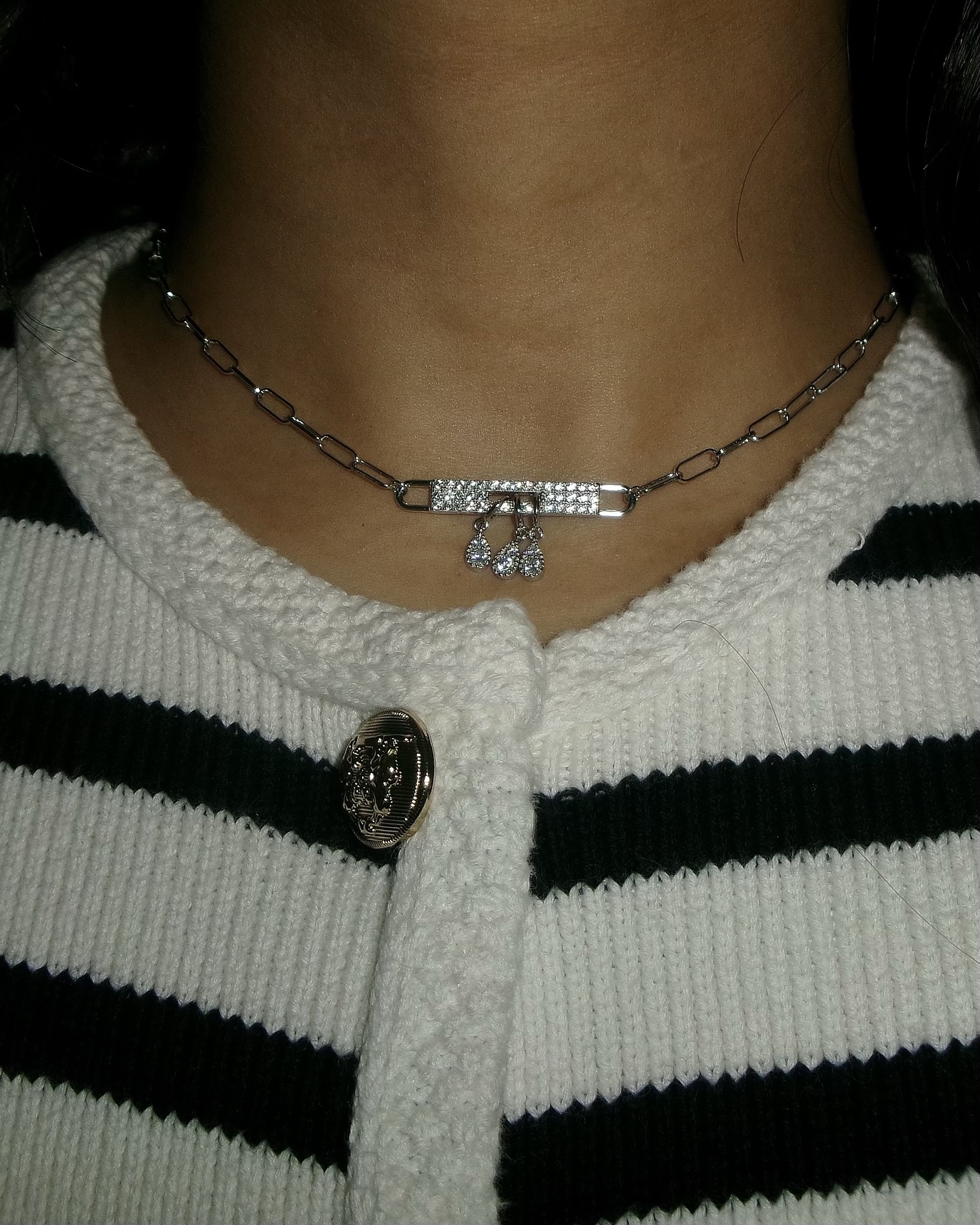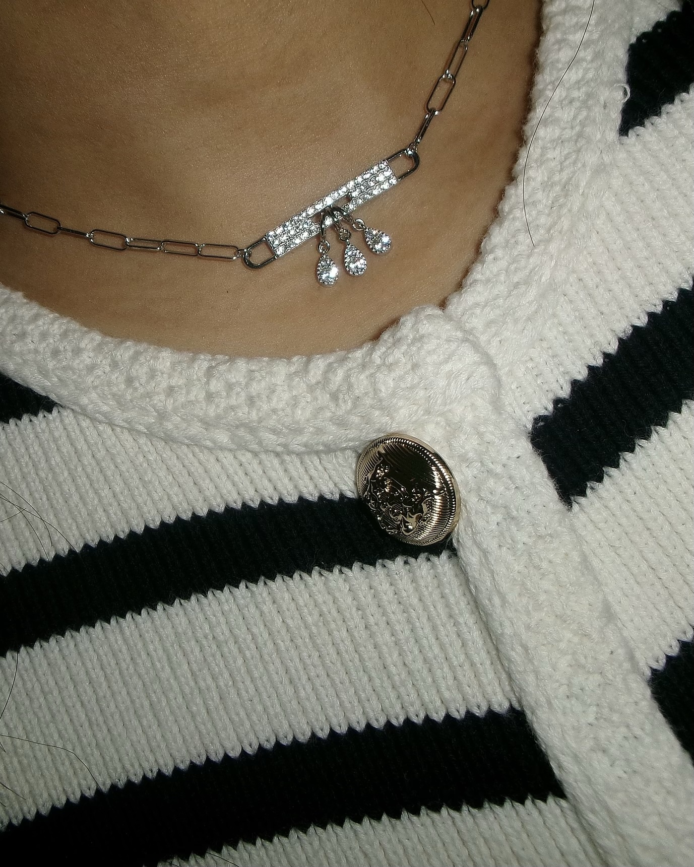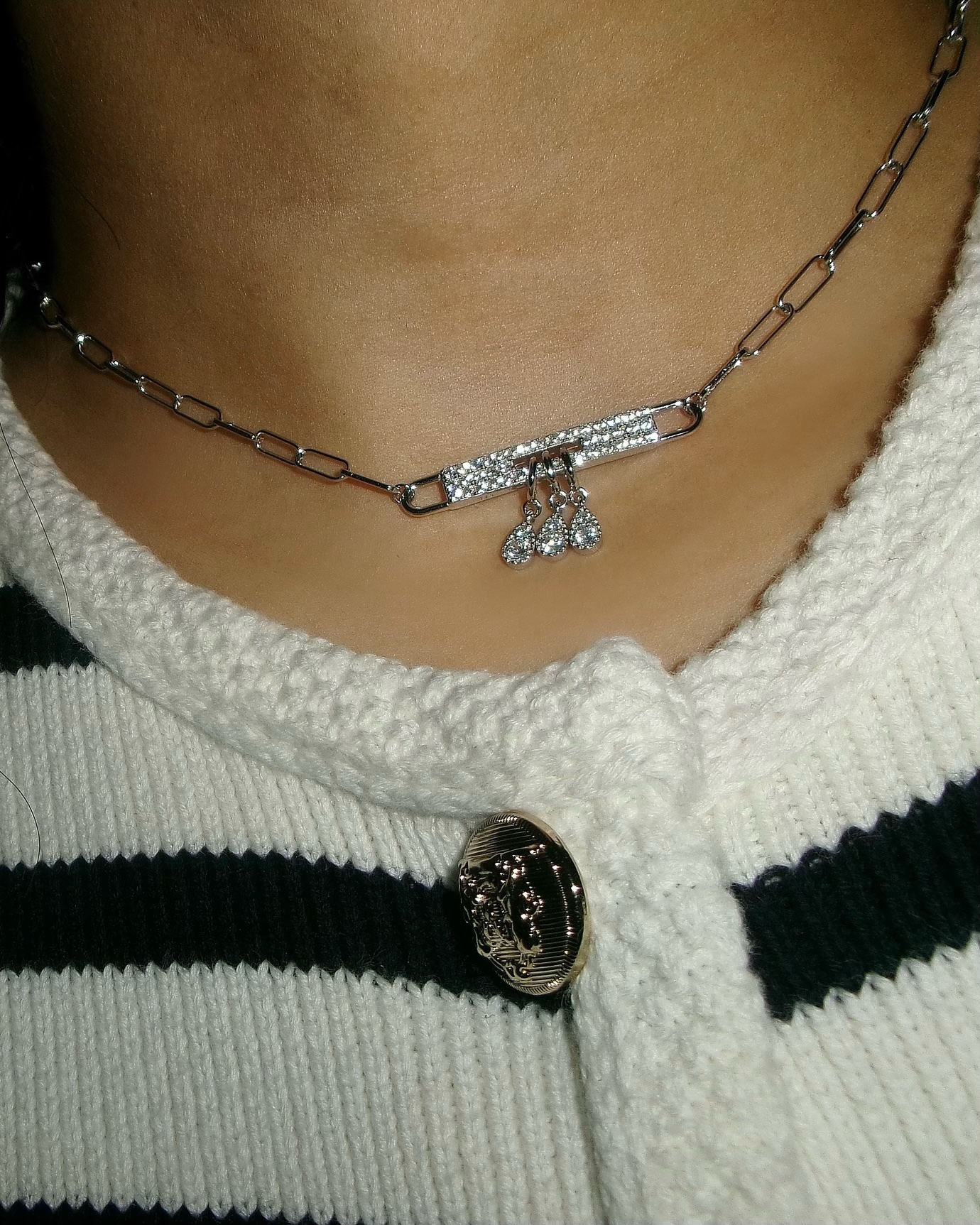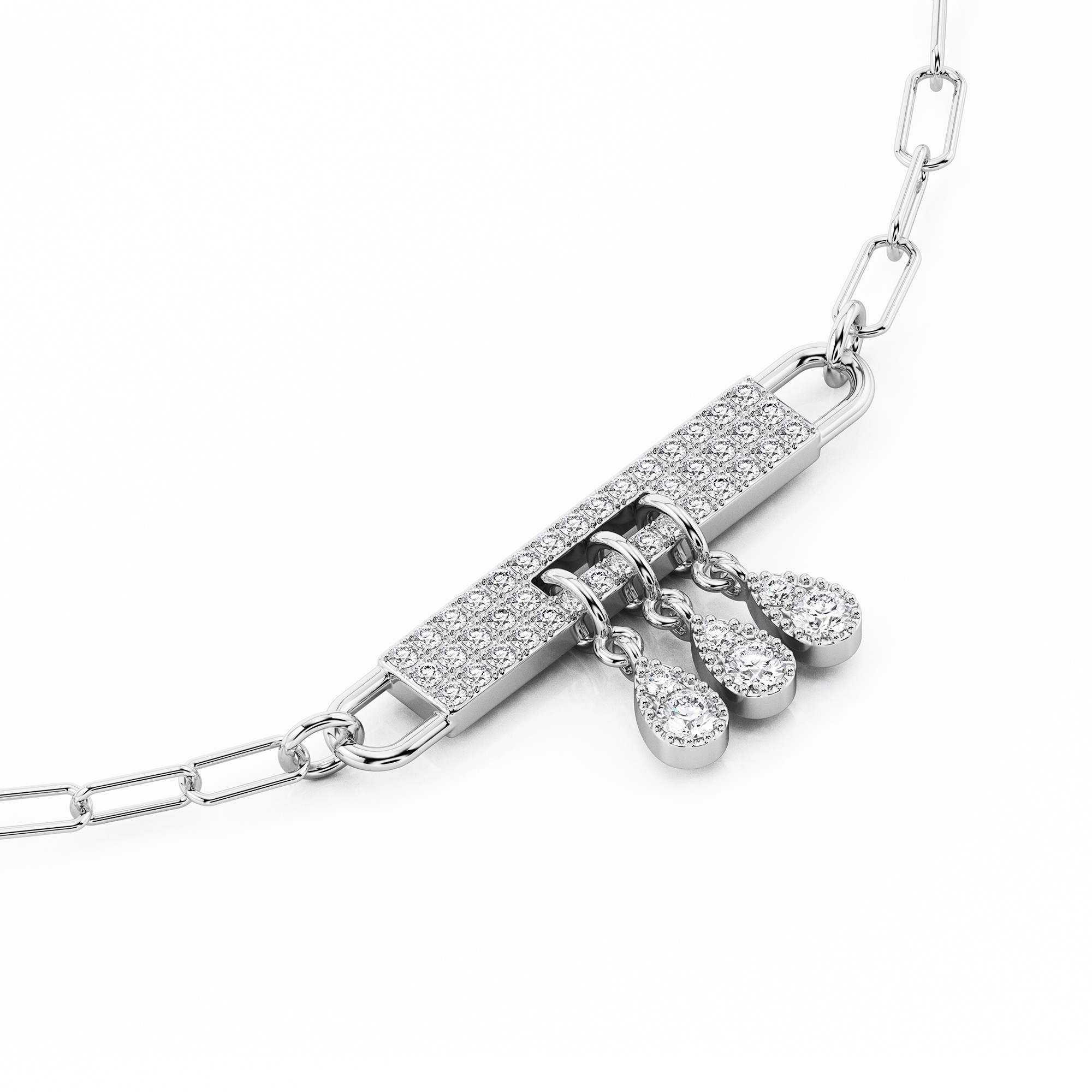 Paved silver bar necklace with three elegant teardrop drops—crafted to embody timeless sophistication and refined luxury.