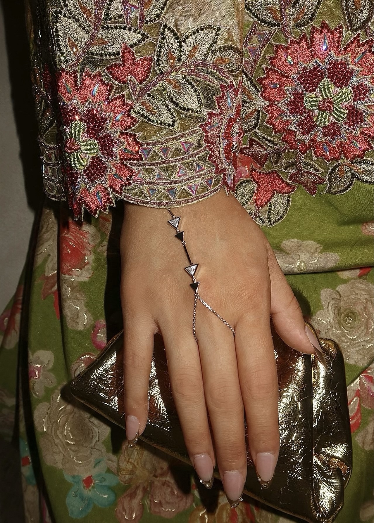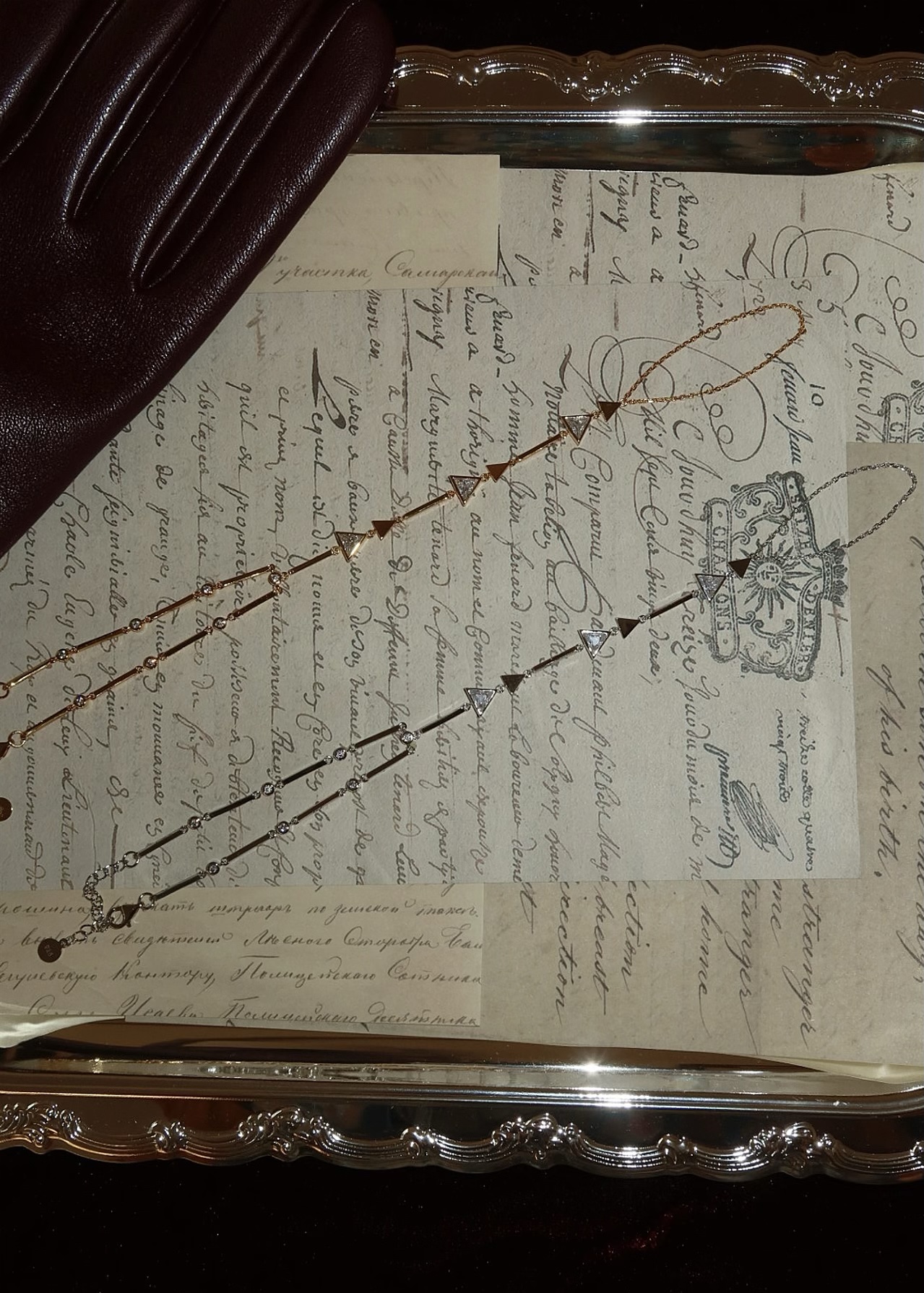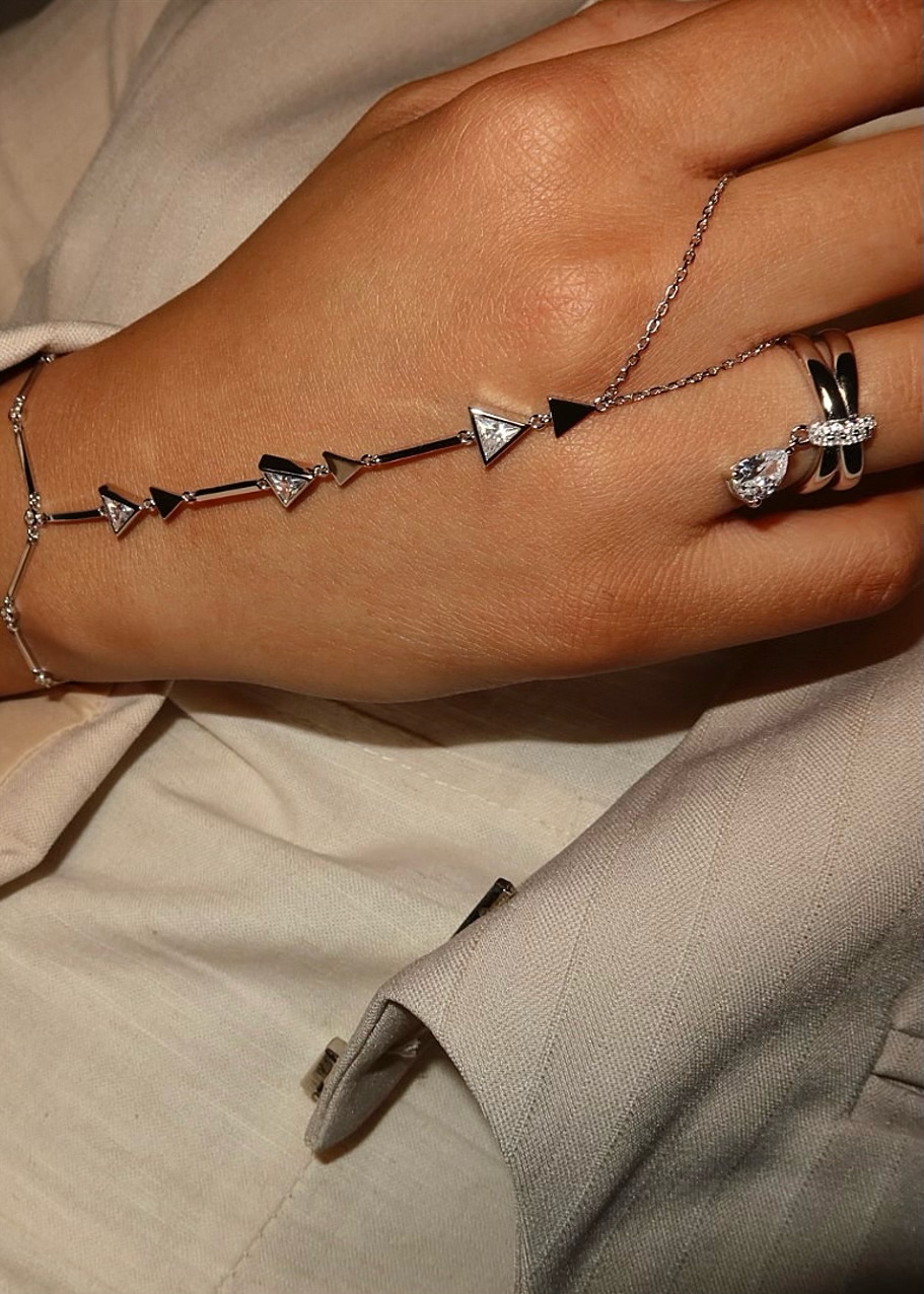 This hand chain stacks geometric triangles with CZ sparkle for a bold, modern statement. Lightweight, adjustable, and built to catch eyes—day or night.