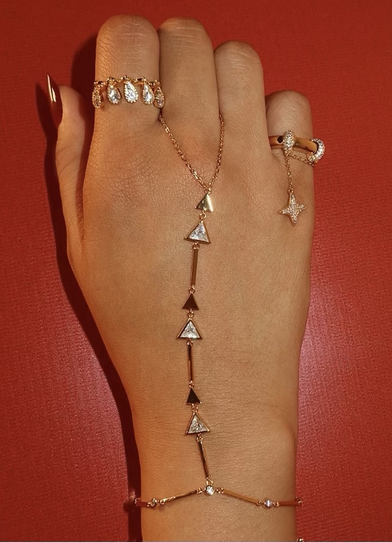 This hand chain stacks geometric triangles with CZ sparkle for a bold, modern statement. Lightweight, adjustable, and built to catch eyes—day or night.